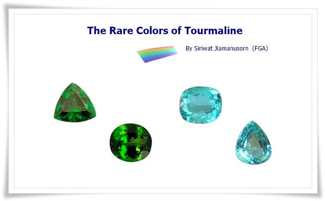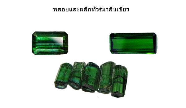 Green Toumaline : คือทัวร์มาลีนสีเขียว ที่ได้สีเขียวอันเกิดจากธาตุเหล็ก (Fe) เป็นสีเขียวลักษณะคล้ำที่เกิดจากการดูดกลืนแสงสูง ถ้านึกภาพไม่ออก ให้ลองไปดูพลอยเขียวส่อง ลองเลือกชนิดที่สีเข้มคล้ำๆ ประมาณว่าต้องส่องกับแดดจึงจะเห็นสีเขียว ด้วยรูปทรงผลึกธรรมชาติที่ยาวแบบ Trigonal Prism การเจียรนัยเพื่อมิให้สีพลอยคล้ำเข้มเกินไปจึงต้องเจียรนัยขนานตามความยาวผลึก (ขนานไปกับแกน C) ดังนั้นเราจึงมักเห็นพลอยรูปร่าง Rectangular ที่ค่อนข้างยาว ถ้าหากเจียรนัยในทิศทางตรงกันข้ามเราก็จะเห็นพลอยที่คล้ำมืดครับ
