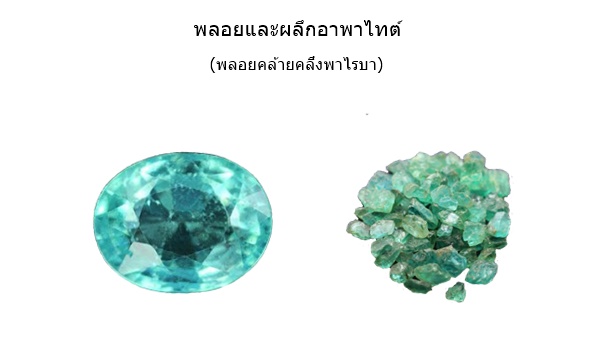 น่าอัศจรรย์ที่ในธรรมชาติก็มีพลอยอยู่ชนิดหนึ่งที่มีสีสันบังเอิญไปพ้องกับสี Paraiba อย่างน่าฉงน เป็นตระกูลพลอยเนื้ออ่อนซึ่่่่งไม่ค่อยเป็นที่รู้จักสักเท่าไร ชื่อว่าแร่ Apatite ซึ่งมี Calcium Phosphate เป็นส่วนประกอบหลัก คุณสมบัติของสีบังเอิญตรงกับ Paraiba ทุกประการ แถมยังเรืองแสงอีกด้วยแบบ Neon Greenish Sky Blue จากกระแสความนิยมในสี Paraiba ดีไซน์เนอร์บางส่วนเริ่มหันมาสนใจพลอยเนื้ออ่อนชนิดนี้ เพื่อเป็นทางเลือกสำหรับ Paraiba ที่มีราคาหลุดโลกไปแล้ว Apatite จากพลอยโนเนมกลายเป็นพลอยดีมีสไตล์ไปด้วยพลังอานิสงค์หนุนนำจาก Paraiba ผมเล่าเป็นเกร็ดขำๆเพื่อบันเทิงนะครับ เพื่อนๆอย่าไปซีเรียส Apatite เลยเป็นอัญมณีล้อเลียน (Imitation) ของ Paraibaไปแล้ว ที่หมือนขนาดว่าถ้านำมาวางเคียงกันเราจะแยกไม่ออกเลยทั้งๆที่เป็นแร่ธาตุต่างชนิดกันโดยสิ้นเชิง ธรรมชาติมักสร้างสรรสิ่งที่เราคาดไม่ถึงเสมอ ระหว่างรอเก็บสตางค์ซื้อ Paraiba ก็ชื่นชม Apatite ไปพลางๆก็ได้...อิอิ..